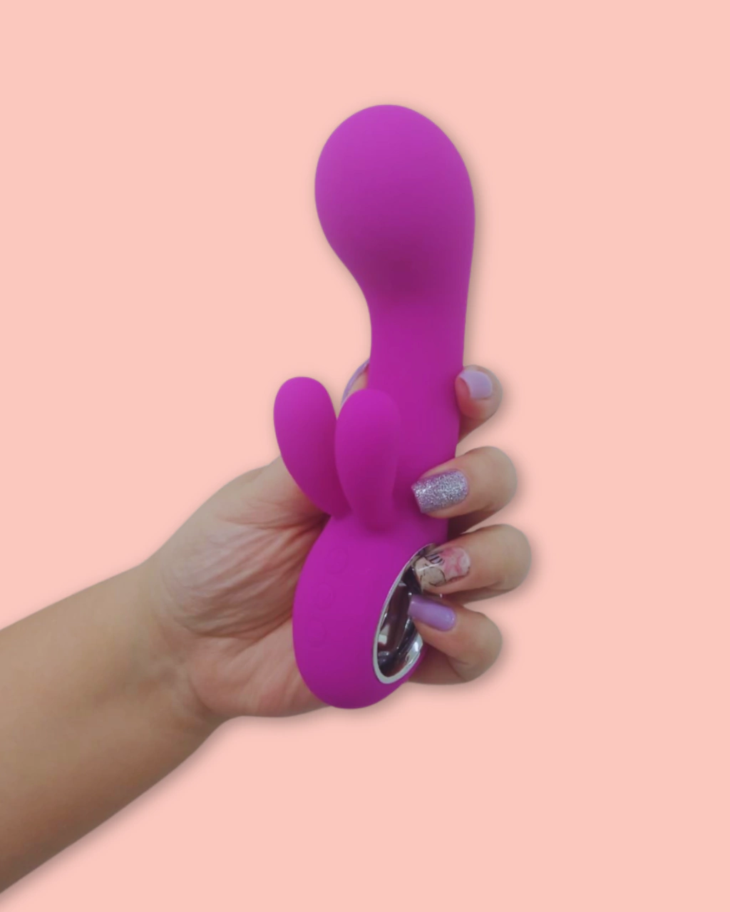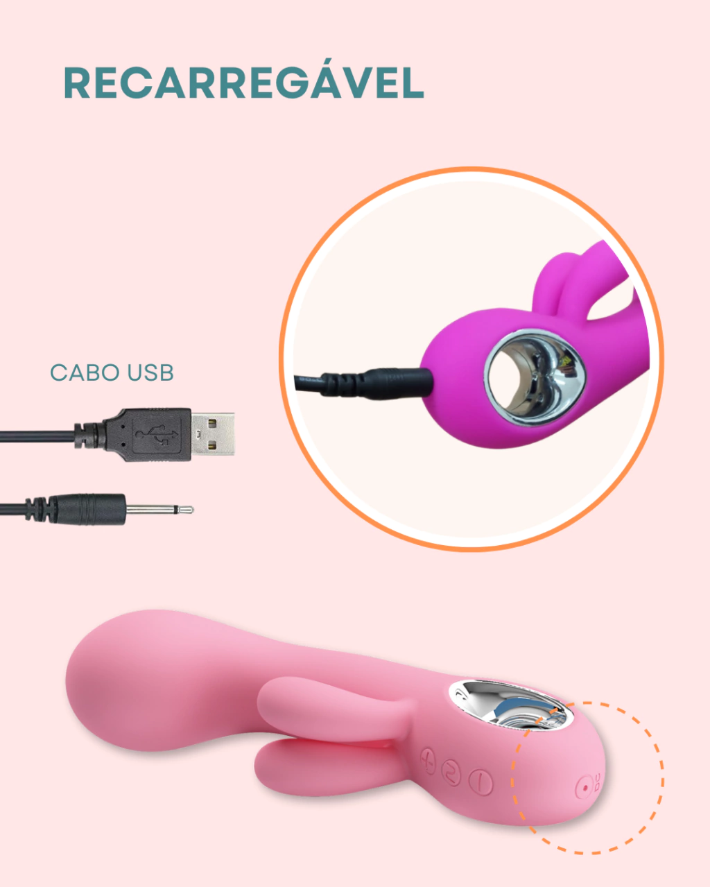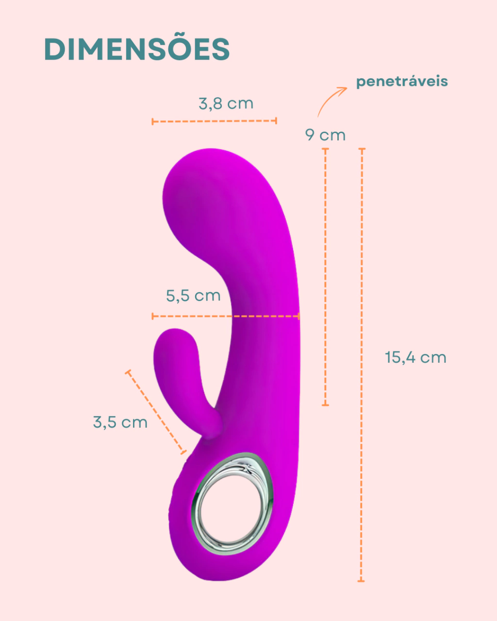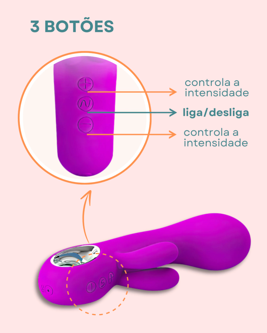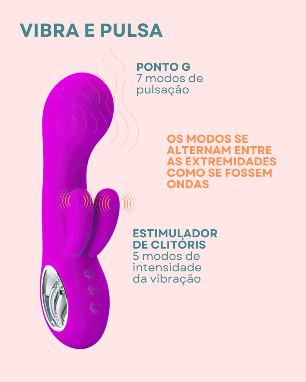 O rabbit (estimulador de clitóris) é duplo e vibra em 5 velocidades; já a parte penetrável pulsa em 7 intensidades diferentes.